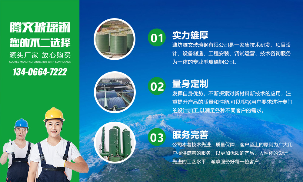 濰坊騰文玻璃鋼有限公司是一家集技術(shù)研發(fā)、項(xiàng)目設(shè)計(jì)、設(shè)備制造、工程安裝、調(diào)試運(yùn)營(yíng)、技術(shù)咨詢服務(wù)為一體的專(zhuān)業(yè)型玻璃鋼公司